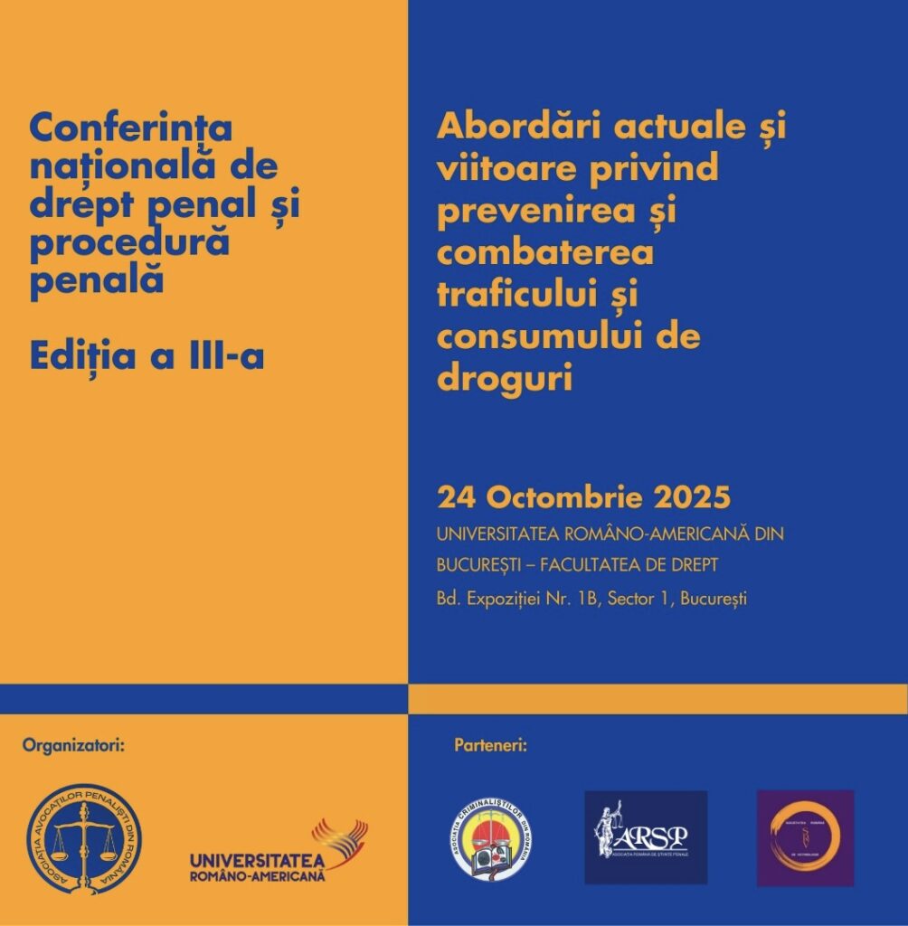 Asociația Avocaților Penaliști din România și Facultatea de Drept a Universității Româno-Americane din București organizează, la data de 24 octombrie 2025, Conferința Națională de Drept Penal și Procedură Penală – […]